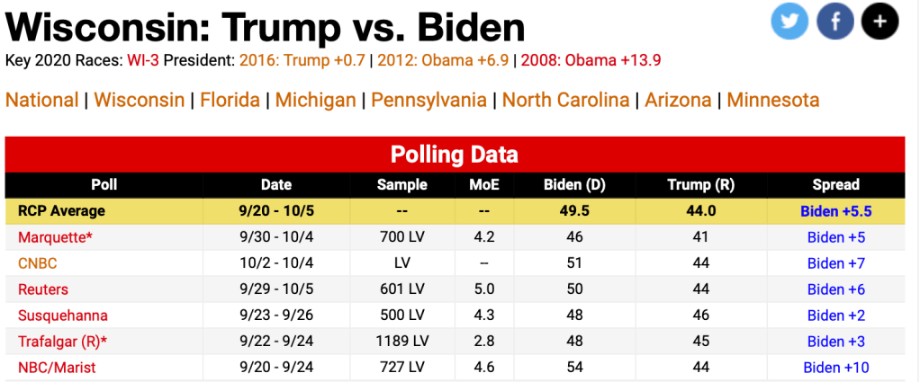 The current RCP average has Biden up by 5.5 points, but with 49.5% of the vote, not 46.8%. If, like in 2016, the polls are missing Trump voters, but getting Biden voters pretty accurately, that’s going to be hard for Trump to make up the difference. Not impossible, because it could end up with Trump getting 50.5% and the polling average being perfectly correct for Biden (and also assumes that Biden’s numbers don’t improve as the race gets closer).