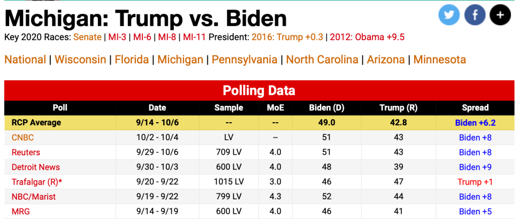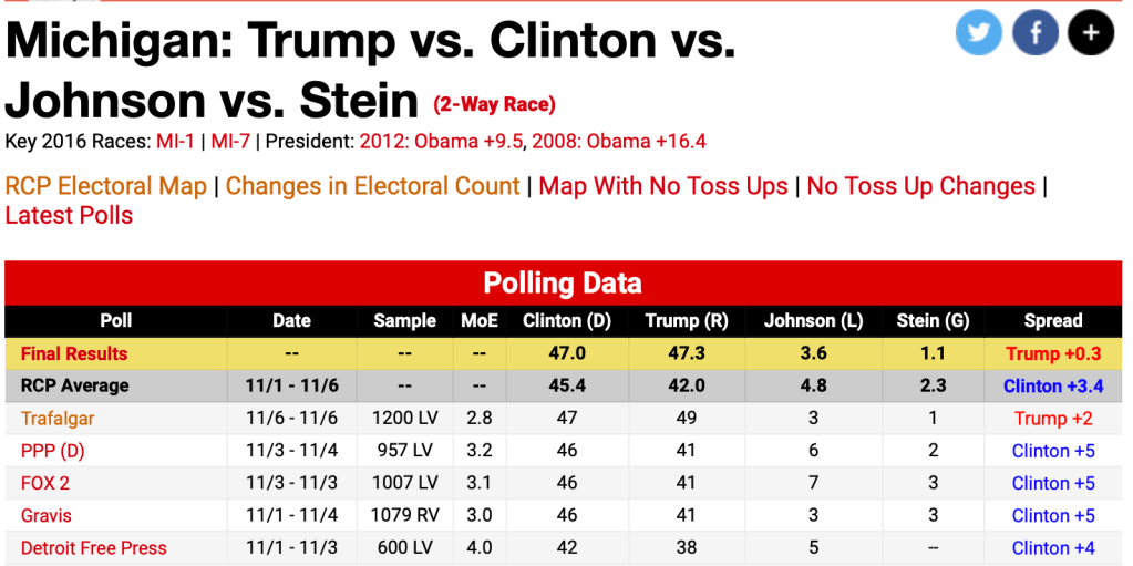 In 2016, the RCP average was a little better in Michigan (“better” meaning less error from the final outcome). Even though Clinton lost, the polls underestimated her support at 45.4%, and she ended up with 47.0%. But the error for Trump was greater, with him getting 47.3% in spite of a predicted 42.0%.