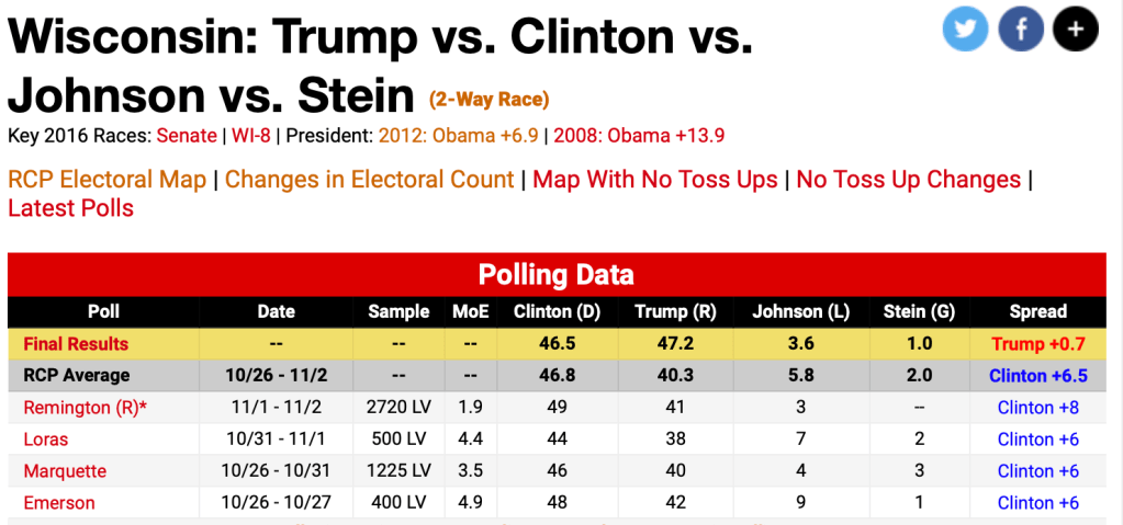 There were a few notable exceptions that made big differences. Wisconsin is one. The image here is a screenshot from Real Clear Politics showing the last few polls in Wisconsin before the 2016 election. Clinton was ahead in all of them by at least 6 points. In the end, Trump won by 0.7 points.