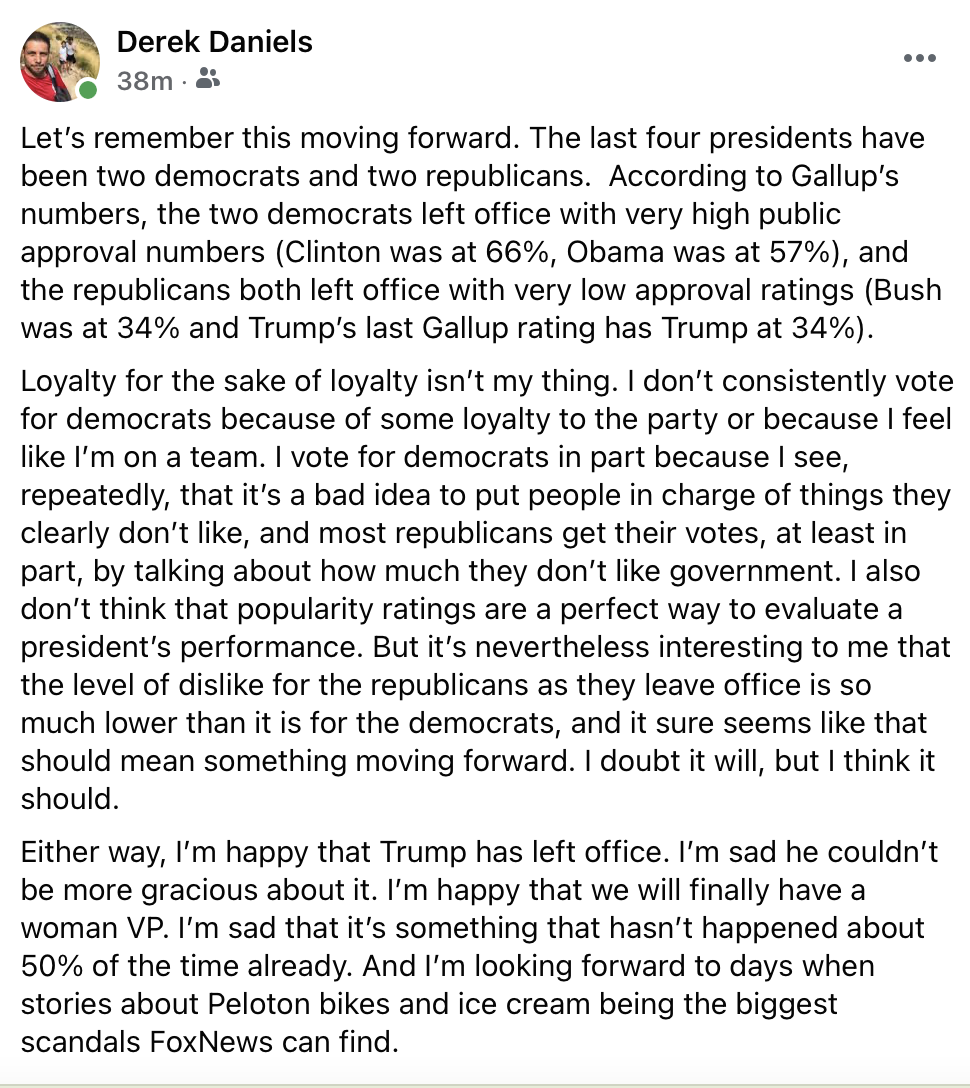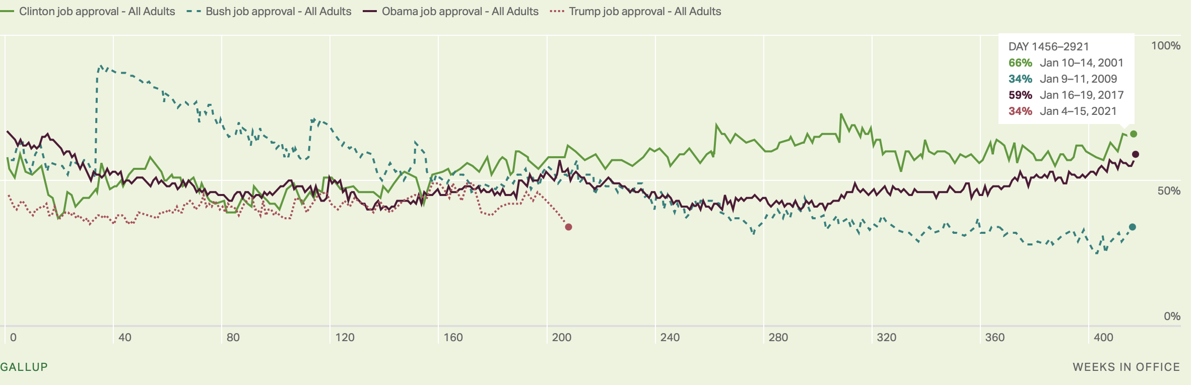 It’s not just remarkable because of the clear difference in approval ratings of republican and democrats leaving office, but there are other things that I find notable. Look at the ends of the terms in office. For every one of them, except for Trump, there is an uptick between election week and the last week in office. Bush goes from 28% approval the week of the election (in which he wasn’t a candidate) to 34% his last week in office. Trump, on the other hand, dropped from 43% to 34% between election week and his last week in office. I suspect that this is because of how poorly Trump has handled losing the election, and because of the riot at the Capitol Building by Trump supporters opposing the election. Regardless of the cause, it’s a notable decrease.