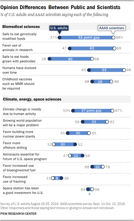 There’s a rather large disconnect between the way that scientists (at least American scientists) and the general public (at least the American public) see things. In some cases, this leads scientists to have opinions that differentiate them from the political party they’re most likely to align with otherwise, and in some cases it seems like it would look the same if you substituted “liberals” for “AAAS scientists.” Look at some (most) of the questions about climate, energy, and space sciences. “Climate change is mostly due to human activity.” About 50% of Americans in the survey agreed with this statement, but 87% of the scientists agreed with it. That doesn’t seem much different from other polls that compare All Americans to Democrats or Liberals. But there are example where that doesn’t seem to hold up. “Favor building more nuclear power plants” has agreement from 45% of the general public (and is more of a republican idea than a democrat idea), but has 65% agreement from scientists. That’s the one I find the most interesting.