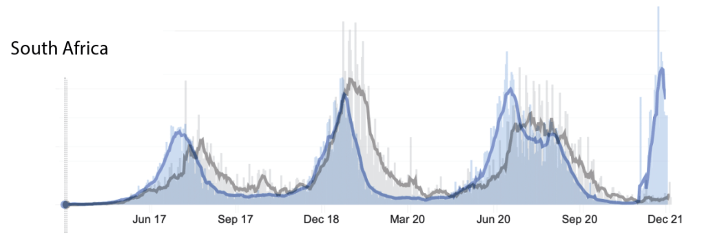 Given my pretty bad track record, I’ve tried to be a little less optimistic, and have been very critical whenever I have these glimpses of thinking there’s good news. So when I kept hearing that omicron is less deadly, it made me wonder if it was just not yet less deadly. Death has always been a bit of a trailing metric. A rise in cases without a rise in deaths has most often been followed by a rise in deaths, so I worried that we were just not there yet. But when I read, and then saw graphs showing, that the surge in South Africa seemed to be on it’s way toward an end, it made me think that the looming possibility of lagging deaths might not happen. So I started capturing graphs and overlying them. New cases and deaths. All auto scaled, so the height of the lines don’t match, and aren’t supposed to, but the proportionate relationship between cases and deaths is clear.