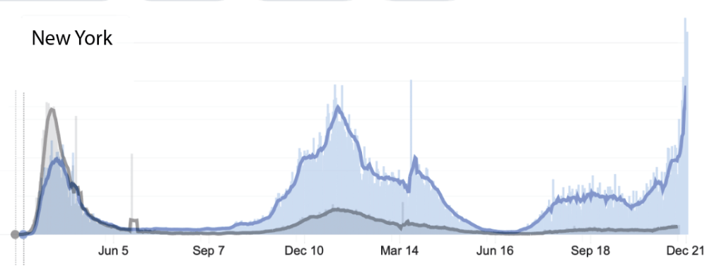 And then there’s the United States, which really can’t be treated as a homogeneous population. Even thinking about states as one thing is probably a mistake on many levels, but I didn’t dive deeper than states for this one. So I started with New York, my home state. New York got hit hard early on, but it’s comforting to see that the first wave was the only wave in which deaths were disproportionately high, relative to cases. In the second wave (winter 2020/2021), the overlay looks a lot different. New York has had a very large surge in new cases in the past week, which could be seen as a fourth wave, if the moderate increase in cases starting in the late summer/early fall is a third wave, that blends into the fourth wave. Whether we call it a third wave or a fourth wave, so far, it hasn’t led to a correlated increase in deaths. My hope is that our current wave will look like South Africa’s fourth wave, and deaths will stay flat even as new cases (of mostly omicron) surge. Fingers crossed.