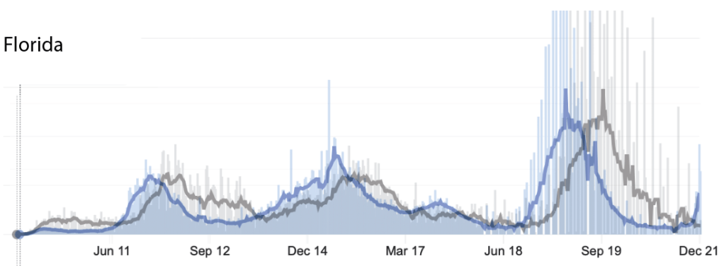 California has also been a bit different from other places. It’s an interesting state because the weather is so different in the northern and southern parts of the state, and because it’s got densely populated areas that are especially challenging with respect to COVID. I also liked including California because I didn’t want to make this a Red State Blue State thing. California largely avoided a first wave, which is completely inconsistent with an earlier notion that COVID spread to the United States from Asia. That very likely would have related to the high level of travel to and from California. The surge in New York that came before the rest of the country seems far more consistent with the idea that the virus made a stop in Europe before coming to the United States. But that’s not the point here. The point here is that California looks a lot more like Florida in terms of the proportion of cases and deaths. The shape and relative height of the lines are remarkably similar. It doesn’t appear that California is experiencing a new wave, but if it comes, it will be very promising if it comes with new cases, but not new deaths.
