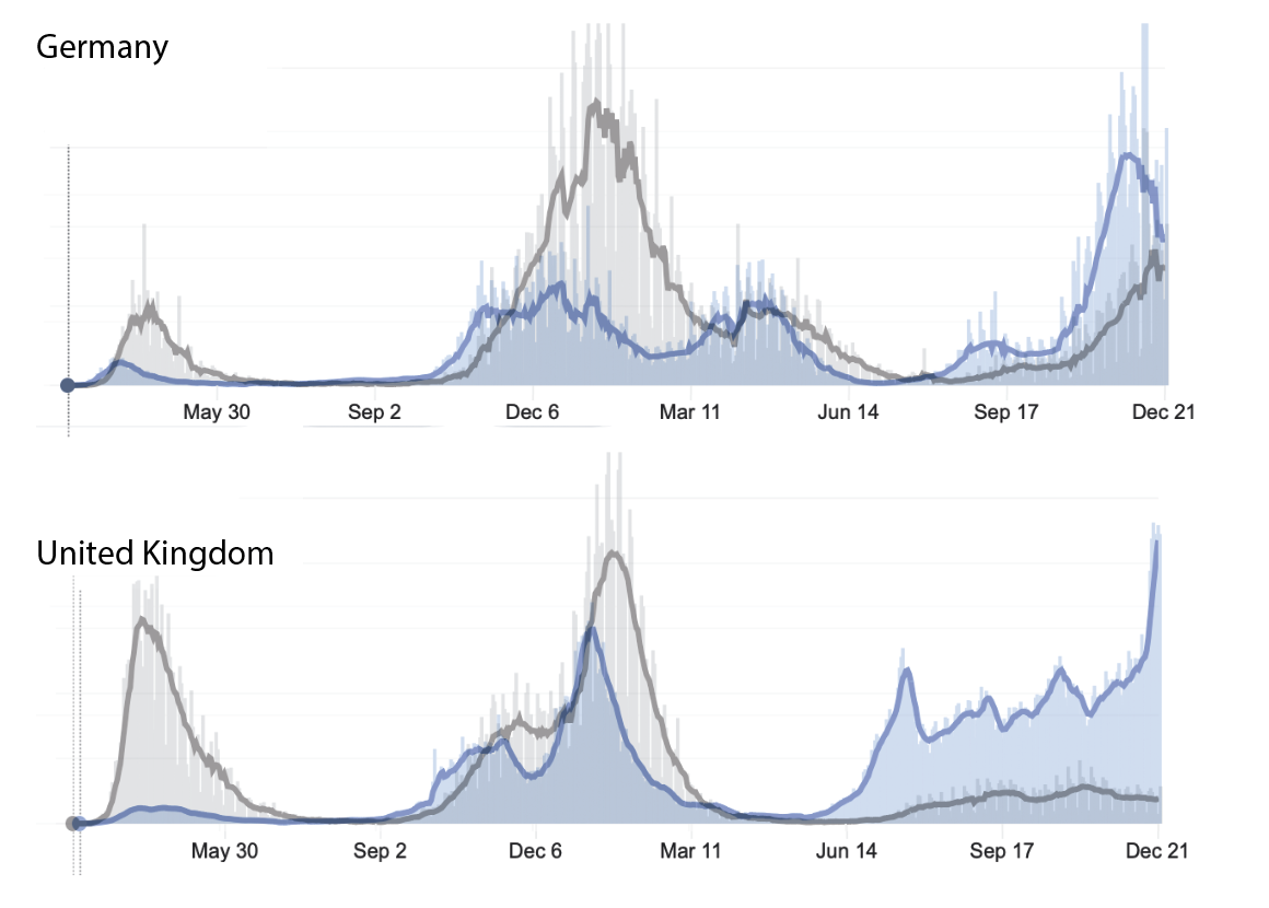 This got me thinking about other places. What about parts of Europe? So I somewhat arbitrarily looked at Germany and the UK and found some notable differences. Both were unlike South Africa in the disproportionate death numbers. Some of this is undoubtely because of autoscaling. Case numbers in Germany hit their highest level in the fall of 2021, with relatively fewer deaths, making the relatively high death rates last winter and at the very start of the pandemic, appear disproportionately high. In the UK, the disproportionate number of deaths early on (in the first wave) is the complete opposite of the third wave, in which deaths appear relatively low.