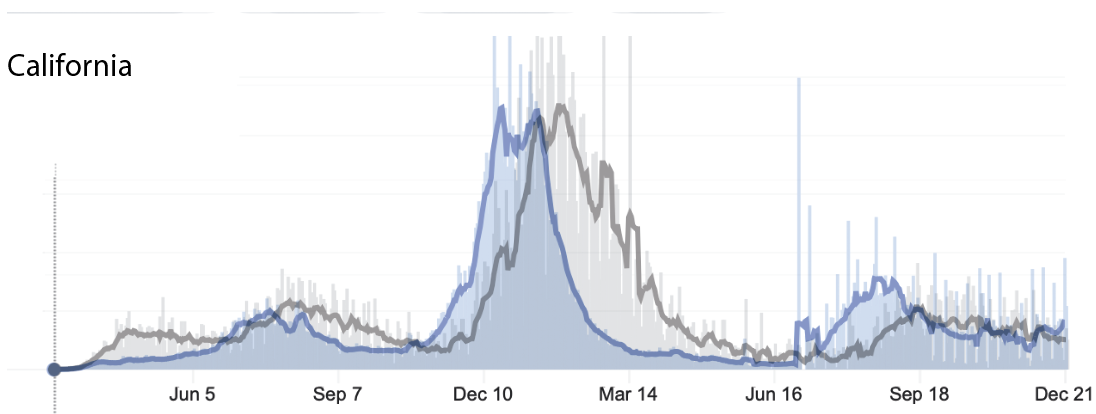 And then there’s the United States, which really can’t be treated as a homogeneous population. Even thinking about states as one thing is probably a mistake on many levels, but I didn’t dive deeper than states for this one. So I started with New York, my home state. New York got hit hard early on, but it’s comforting to see that the first wave was the only wave in which deaths were disproportionately high, relative to cases. In the second wave (winter 2020/2021), the overlay looks a lot different. New York has had a very large surge in new cases in the past week, which could be seen as a fourth wave, if the moderate increase in cases starting in the late summer/early fall is a third wave, that blends into the fourth wave. Whether we call it a third wave or a fourth wave, so far, it hasn’t led to a correlated increase in deaths. My hope is that our current wave will look like South Africa’s fourth wave, and deaths will stay flat even as new cases (of mostly omicron) surge. Fingers crossed.