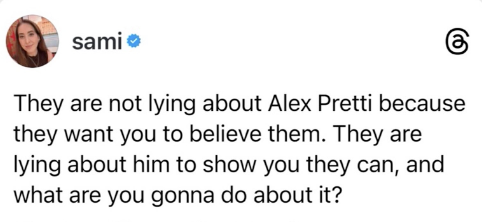 And now we come to the recent events, and the post that made me jump over here. This person, sami, got it just right. They aren’t lying to make us believe anything. They are lying to exert their power over us. To exert their power over the narrative. And there are many who are going along with it. Not because they believe it (although I imagine some trust the administration enough to not question them), but because they want to be on the bully’s side. They want to be standing beside him while he wears your hat and says it’s his.