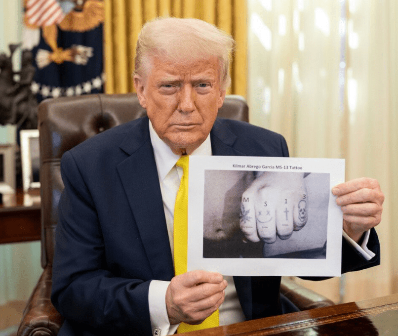 That quote, from the This American Life episode mentioned above, nails it. I remember watching an Oval Office interview with Trump. I can’t recall the reporter’s name, but they were talking about the clearly edited photograph of Kilmar Abrego Garcia’s hands. The photograph was obviously edited, perhaps in good faith, providing labels of the tattoos on his hands. A reasonable person understands that the text M S 1 3 was added to make the case that his unlabeled tattoo was a series of symbols that, put together, made the name of the notorious gang, MS-13.